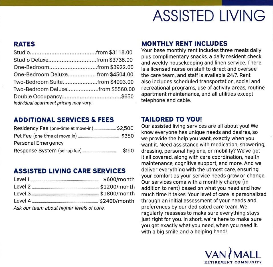My mom has been a resident at Van Mall Retirement for 2.5 years. She has received great care, especially when a health crisis arose. The care takers are both qualified in their roles and friendly to the residents. Health and Wellness communicate with doctors, hospitals, and pharmacies efficiently. My mom calls her apartment “home” and takes advantage of activities and outings. It is worth a serious look.